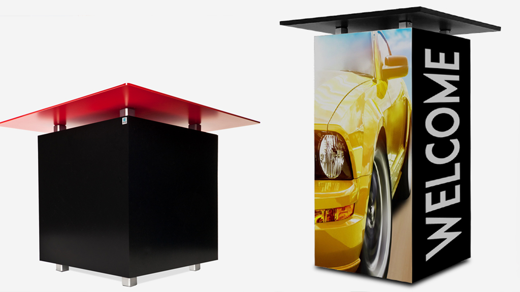 Verwandeln Sie einen Cubus Cultus Würfel in das Möbelstück, das Sie gerade brauchen! Erstellen Sie zum Beispiel Präsentationspodeste, Loungetische, Stehtische, Theken oder stabil fixierte Sitzgruppen mit unserem einzigartigen Würfelmöbel. Diverse Zubehöre wie Tischplatten (Glas oder Holz), Standfüße/Rollen, Prospekthalter oder Vitrinenaufsatz sind durch das integrierte Verbindungssystem einfach und flexibel anzubringen. Außerdem können mehrere Cubus Cultus Würfel miteinander verbunden werden. Ein Messemöbel mit Multifunktion und Rundum-Werbefläche!